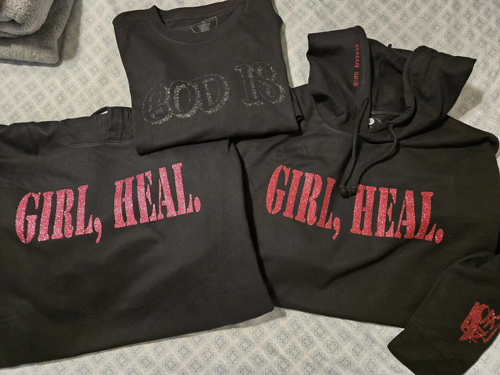 Note: The GIRL, HEAL. and sleeve logo will be Glitter. The glitter options are "Blush (Pink)" or "Red".