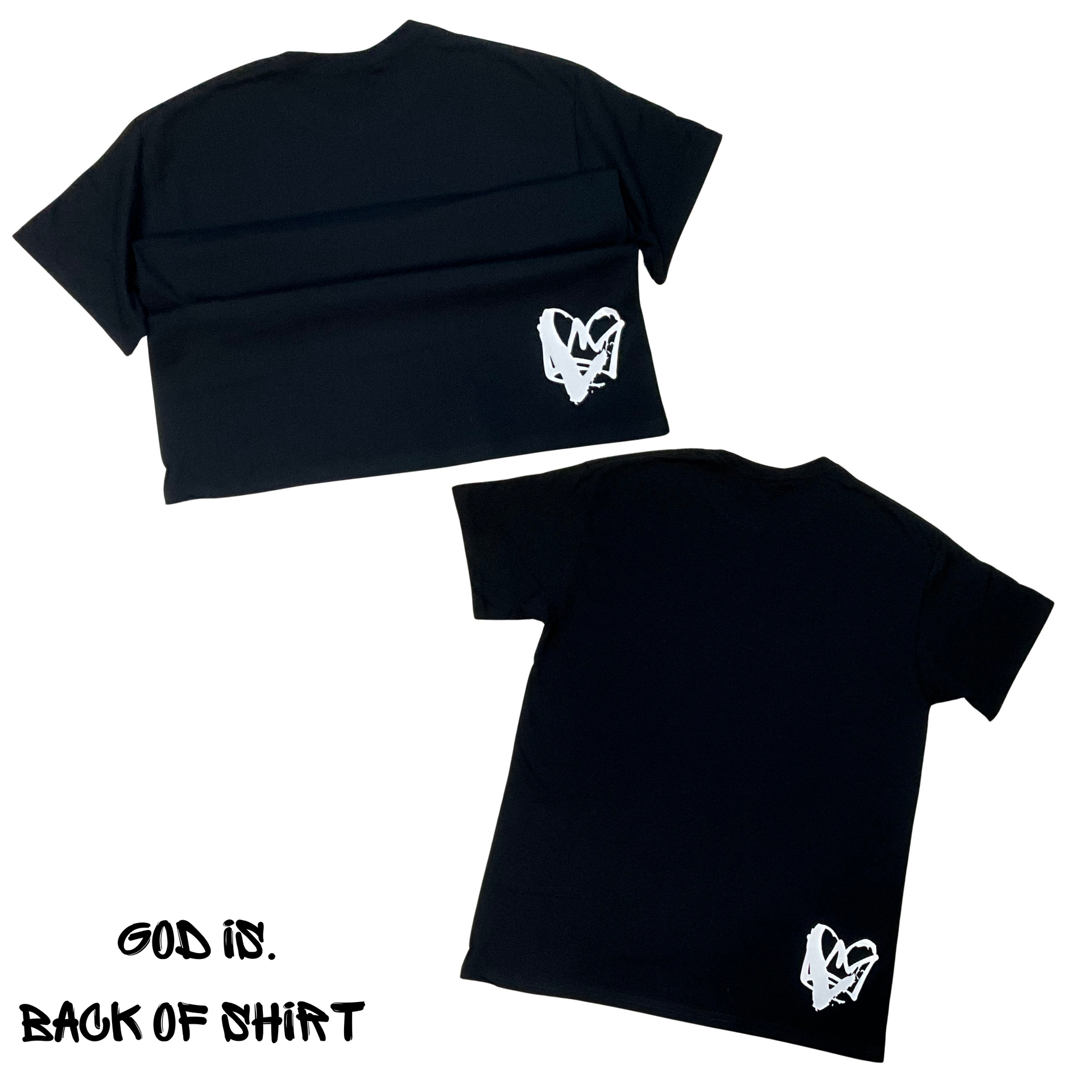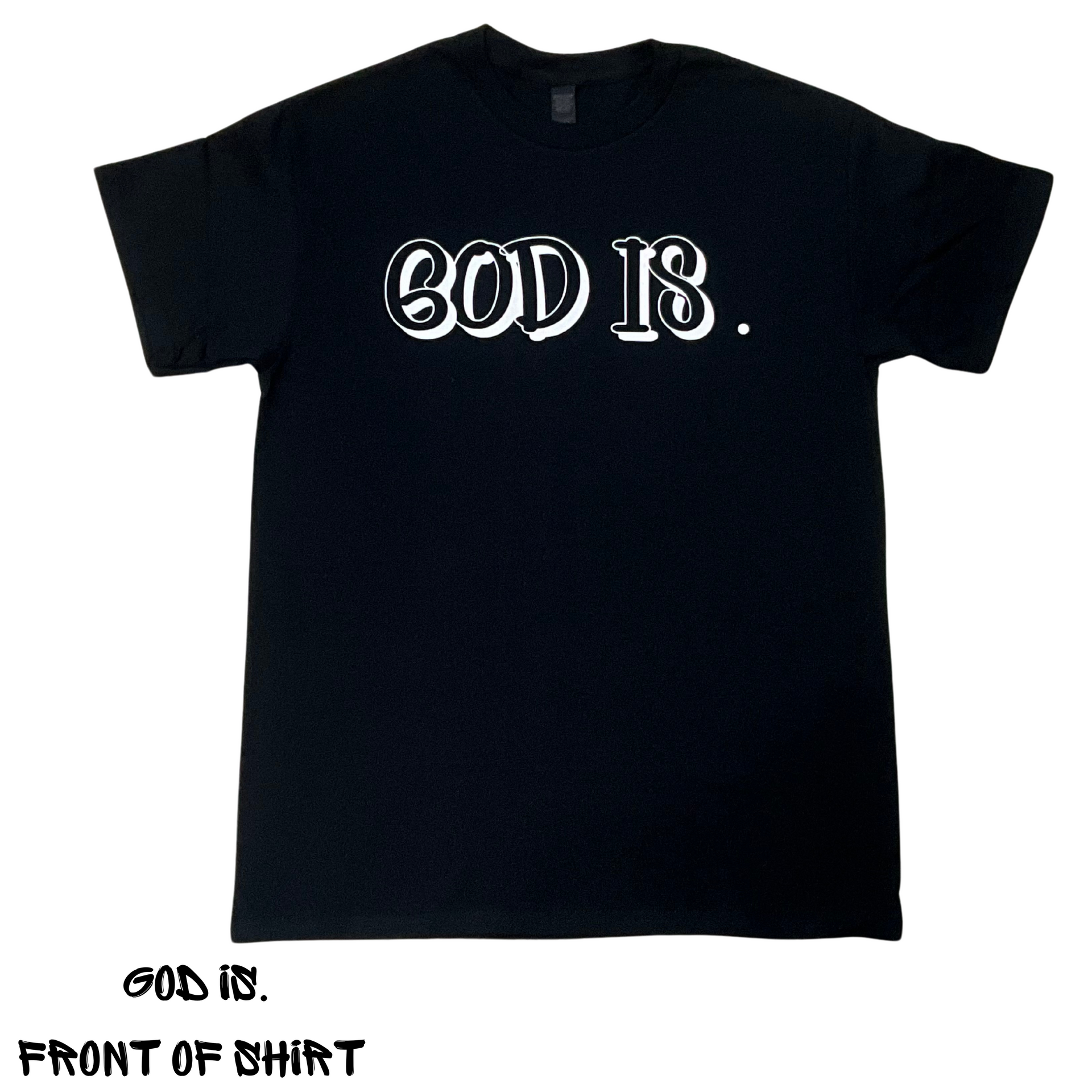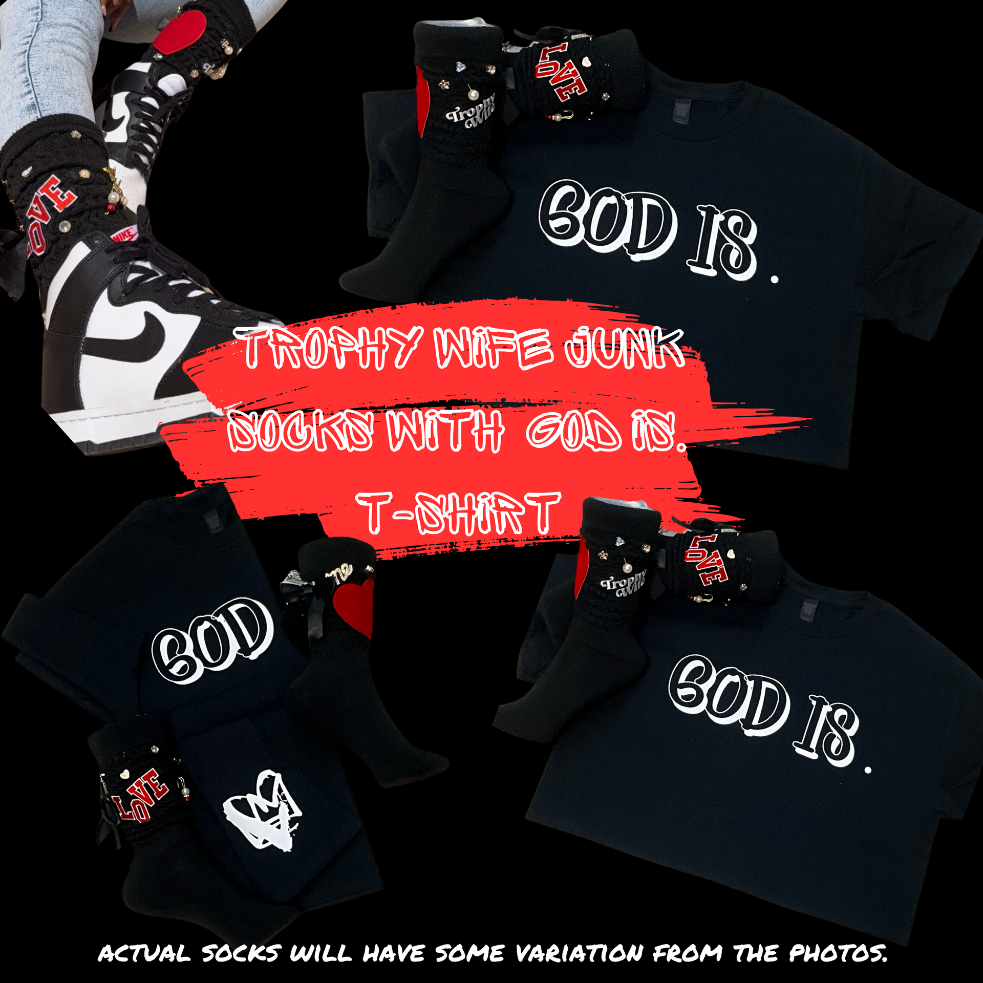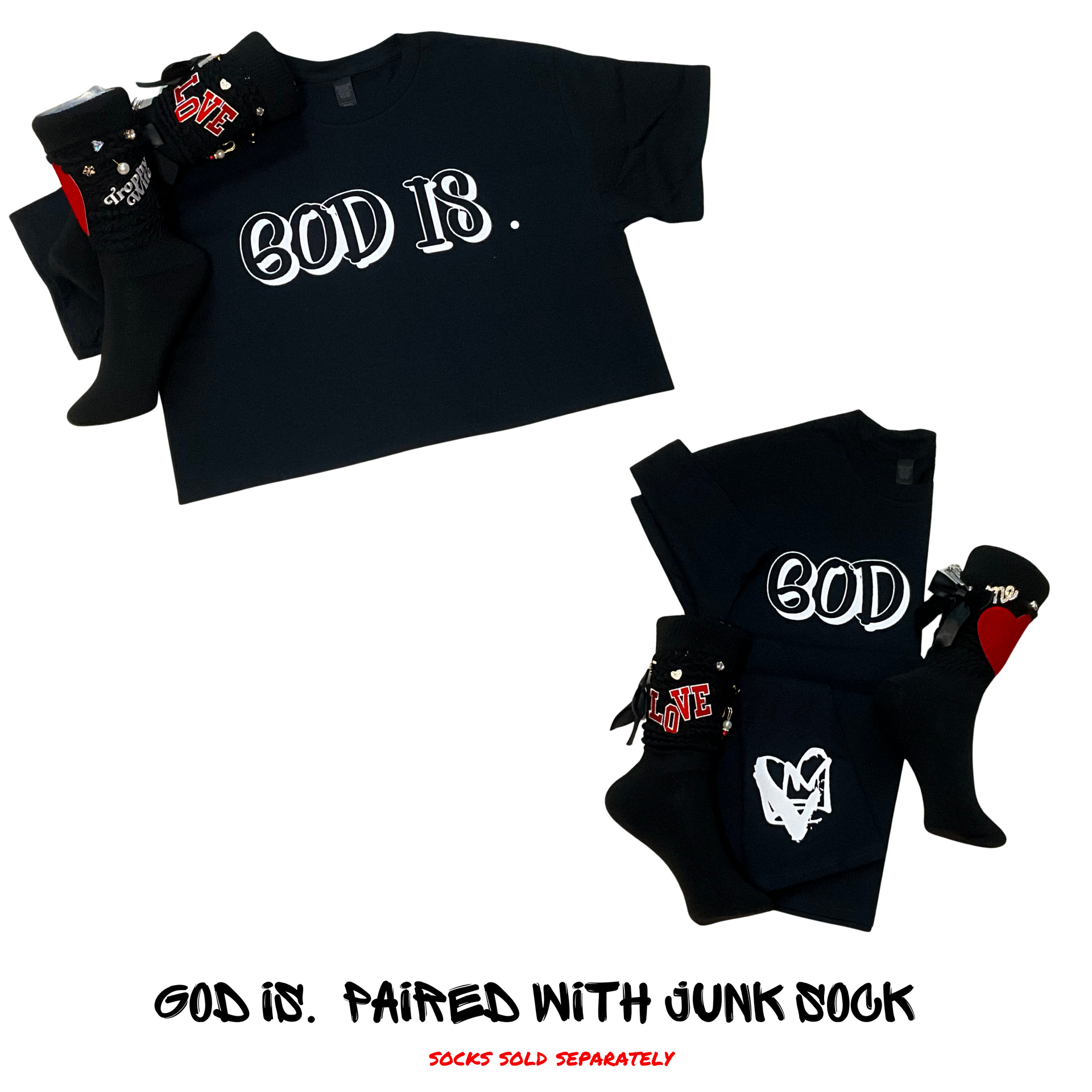 Indulge in the luxury of GOD IS., a statement piece that embodies the essence of love. Its comfortable design will envelop you in divine comfort, allowing you to fully appreciate its powerful message. Elevate your style with this exclusive piece that exudes elegance and taste.  Pair this Shirt with a pair of Extra Bling Junk Socks!!  Shirt Colors: Black, Pink or Red Picture for illustration...View more